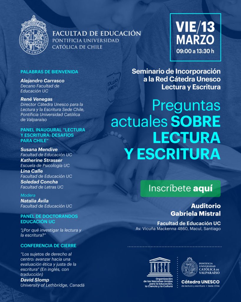 El pasado viernes 13 de marzo de 2026, la investigadora Natalia Ávila, organizó el seminario “Preguntas actuales sobre lectura y escritura”, realizado en la Facultad de Educación de la Pontificia Universidad Católica de Chile, en el marco de la incorporación a la Red Cátedra UNESCO de Lectura y Escritura.